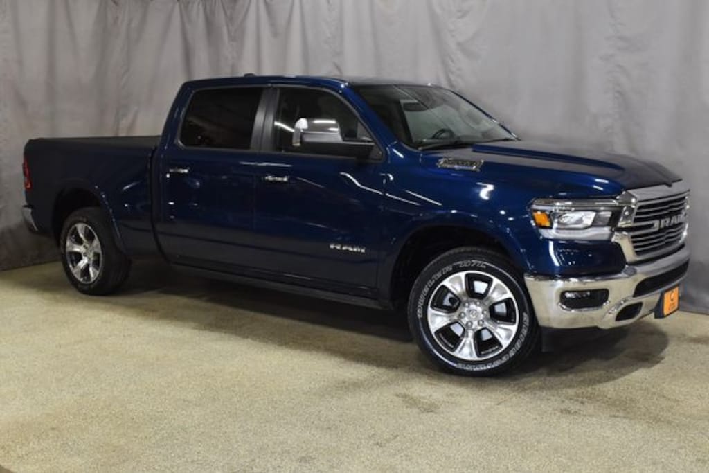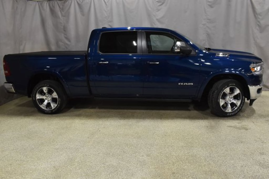 RAM FACTORY CERTIFIED PRE-OWNED VEHICLE!! LOCAL ONE OWNER 2022 RAM 1500 LARAMIE CREW CAB 4X4 WITH THE 5.7L HEMI V8, LARAMIE LEVEL 2 EQUIPMENT GROUP, HEATED AND VENTILATED PREMIUM LARAMIE LEATHER BUCKET SEATS, HEATED LEATHER WRAPPED STEERING WHEEL, POWER DRIVER AND PASSENGER SEATS, TOUCHSCREEN NAVIGATION INFOTAINMENT CENTER, HARMON KARDON 19-SPEAKER PREMIUM AUDIO SYSTEM, BACKUP CAMERA, FRONT AND REAR PARK ASSIST, BLIND SPOT MONITORING AND CROSS PATH DETECTION, POWER RUNNING BOARDS, CHROME POWER FOLDING TRAILER TOW MIRRORS, INTEGRATED TRAILER TRAKE CONTROLLER, TRAILER REVERSE STEERING CONTOL, CLASS IV TRAILER HITCH, BED UTILTY GROUP, 20" POLISHED ALUMINUM WHEELS, CLEAN ONE OWNER CARFAX VEHICLE HISTORY REPORT AND THIS RAM 1500 IS A RAM CERTIFIED PRE-OWNED VEHICLE WITH FACTORY BACKED WARRANTY UNTIL MAY 2029 OR 100,000 MILES!!