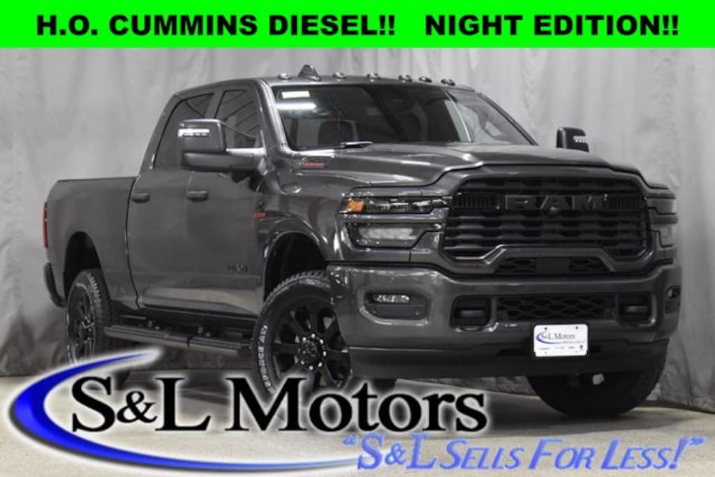 GRANITE CRYSTAL METALLIC 2025 RAM 2500HD BIG HORN NIGHT EDITION CREW CAB 4X4 WITH THE HIGH OUTPUT CUMMINS TURBO DIESEL, 8-SPEED AUTOMATIC TRANSMISSION, HEATED PREMIUM BUCKET SEATS/STEERING WHEEL, 12" TOUCHSCREEN NAVIGATION INFOTAINMENT CENTER, BACKUP AND CARGO BED CAMERAS, 5TH WHEEL/GOOSENECK PREP PACKAGE, WHEEL TO WHEEL MOPAR SIDE STEPS, 20" BLACK WHEELS!!