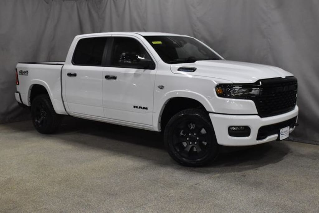 OFF ROAD PACKAGE!! BRIGHT WHITE 2026 RAM 1500 BIG HORN NIGHT EDITION CREW CAB 4X4 WITH THE 5.7L HEMI V8 ENGINE, HEATED PREMIUM BUCKET SEATS, HEATED LEATHER WRAPPED STEERING WHEEL, 12" TOUCHSCREEN NAVIGATION INFOTAINMENT CENTER, ALPINE 9-SPEAKER PREMIUM AUDIO SYSTEM, INTEGRATED TRAILER BRAKE CONTROLLER, CLASS IV TRAILER HITCH, OFF ROAD SUSPENSION, SEMI GLOSS BLACK ALUMINUM WHEELS AND RAM'S 10 YEAR/100,000 MILE FACTORY WARRANTY!!