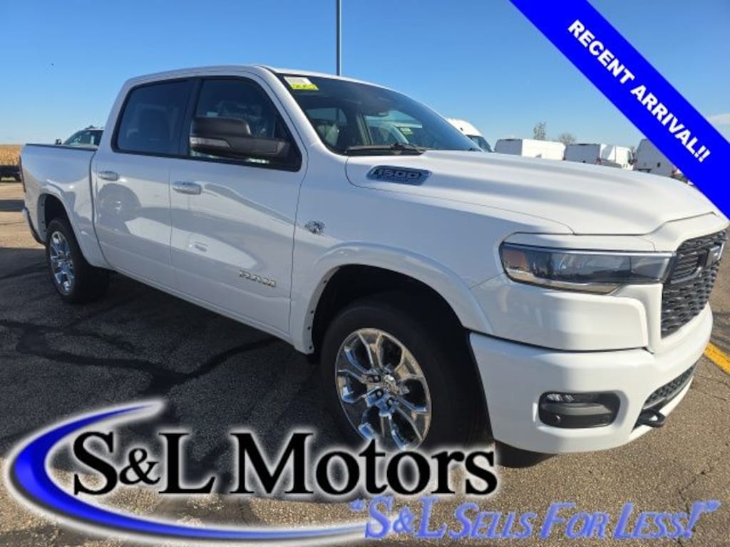 HEMI V8 SPORT!! BRIGHT WHITE 2026 RAM 1500 BIG HORN SPORT CREW CAB 4X4 WITH THE 5.7L HEMI V8 ENGINE, BIG HORN LEVEL 2, BED UTILITY AND PROTECTION GROUPS, HEATED PREMIUM CLOTH BUCKET SEATS/STEERING WHEEL, 12" TOUCHSCREEN NAVIGATION INFOTAINMENT CENTER, ALPINE 9-SPEAKER PREMIUM AUDIO SYSTEM, INTEGRATED TRAILER BRAKE CONTROLLER, WIRELESS CHARGING PAD, 12" TFT COLOR INSTRUMENT CLUSTER, POWER SLIDING REAR WINDOW, INTEGRATED TRAILER BRAKE CONTROLLER, SPRAY IN BEDLINER, LED BED LIGHTS, DEPLOYABLE BED STEP, TOW HOOKS, SKID PLATES, 20" CHROME ALUMINUM WHEELS AND RAM'S 10 YEAR/100,000 MILE FACTORY WARRANTY!
