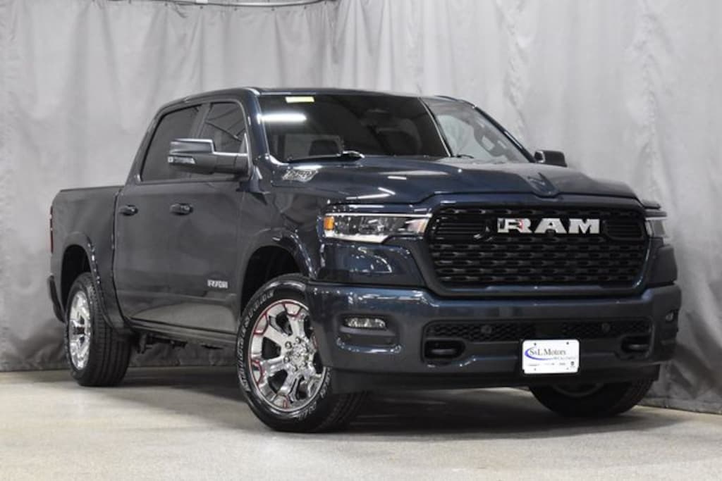 FORGED BLUE METALLIC 2026 RAM 1500 BIG HORN SPORT CREW CAB 4X4 WITH HEATED BUCKET SEATS, TOUCHSCREEN INFOTAINMENT CENTER, PROTECTION GROUP, 20" CHROME ALUMINUM WHEELS AND RAM'S 10 YEAR/100,000 MILE FACTORY WARRANTY!! 3.0L Hurricane Twin Turbo I6, 8-Speed Automatic Transmission, 4WD, Heated Premium Bucket Seats, Heated Leather Wrapped Steering Wheel, Power Driver Seat, Power Adjustable Pedals, 8.4" Touchscreen Infotainment Center, Apple CarPlay/Google Android Auto, Power Sliding Rear Window, Integrated Trailer Brake Controller, Body Color Flares, Class IV Trailer Hitch, 20" Chrome Aluminum Wheels And Ram's 10 Year/100,000 Mile Factory Warranty!