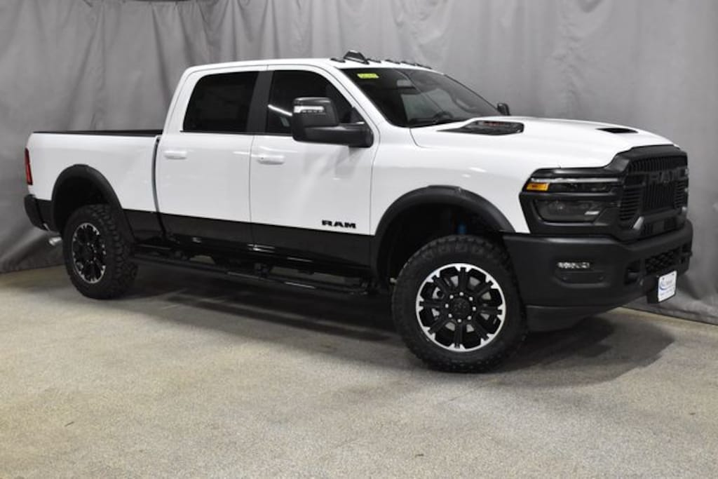 BRIGHT WHITE 2026 RAM 2500HD REBEL CREW CAB 4X4 WITH THE 6.4L HEMI V8 ENGINE, REBEL OFF ROAD SUSPENSION, ELECTRONIC LOCKING REAR AXLE, HEATED AND COOLED PREMIUM LEATHER BUCKET SEATS, HEATED SECOND ROW SEATING, HEATED STEERING WHEEL, 12" TOUCHSCREEN NAVIGATION, ALPINE 9-SPEAKER PREMIUM AUDIO SYSTEM, POWER SLIDING REAR WINDOW, 5TH WHEEL/GOOSENECK PREP PACKAGE, BACKUP AND CARGO VIEW CAMERAS, SPORT PERFORMANCE HOOD, MOPAR WHEEL TO WHEEL PAINTED SIDE STEPS, SPRAY IN BEDLINER AND 20" BLACK DIAMOND CUT ALUMINUM WHEELS WITH LT285/60R20 ALL TERRAIN TIRES!!