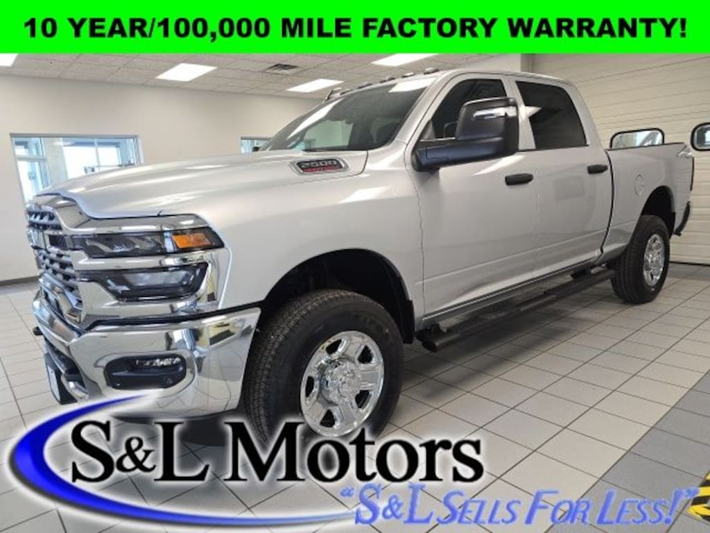 SILVER ZYNITH METALLIC 2026 RAM 2500HD TRADESMAN CREW CAB 4X4 WITH THE 6.4L HEMI V8, 8-SPEED AUTOMATIC TRANSMISSION, TRADESMAN LEVEL 2 GROUP, SNOW PLOW READY, PREMIUM CLOTH 40/20/40 SPLIT BENCH SEAT WITH FOLD DOWN CENTER CONSOLE, 12:" TOUCHSCREEN NAVIGATION INFOTAINMENT CENTER, APPLE CARPLAY/GOOGLE ANDROID AUTO, SIRIUSXM SATELLITE RADIO, BACKUP CAMERA, POWER SLIDING REAR WINOW WITH DEFROST, SPRAY IN BEDLINER, LED BED LIGHTS, DEPLOYABLE BED STEP, CAB CLEARANCE LAMPS, TRANSFER CASE SKID PLATE, 18" CHROME WHEELS AND RAM'S 10 YEAR/100,000 MILE FACTORY WARRANTY!