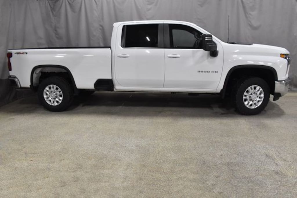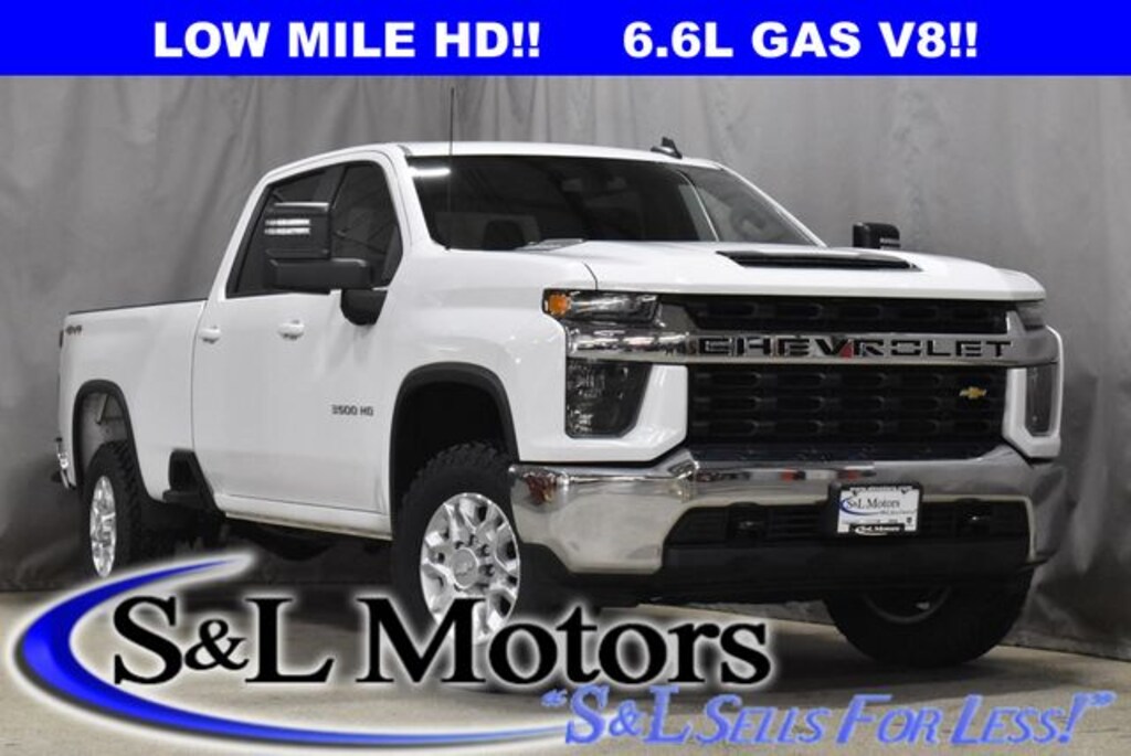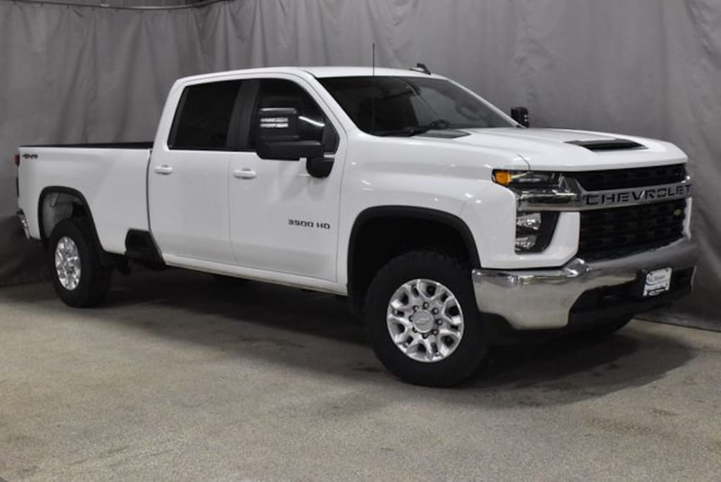LOW MILE HEAVY DUTY!! BRIGHT WHITE 2020 SILVERADO 3500HD LT CREW CAB 4X4 SINGLE REAR WHEEL WITH 8' CARGO BED, 6.6L V8, LOCKING REAR DIFFERENTIAL AXLE WITH 3.73 GEAR RATIO, SKID PLATES, PREMIUM CLOTH 40/20/40 SPLIT BENCH SEAT WITH FOLD DOWN CENTER CONSOLE, POWER DRIVER SEAT, 8" TOUCHSCREEN INFOTAINMENT CENTER, APPLE CARPLAY/GOOGLE ANDROID AUTO, INTEGRATED TRAILER BRAKE CONTROLLER, POWER ADJUSTABLE HEATED TRAILER TOW MIRRORS, CLASS V TRAILER HITCH, 18" ALUMINUM WHEELS, CLEAN CARFAX VEHICLE HISTORY REPORT AND S&L QUALITY CERTIFIED 24 MONTH/100,000 MILE WARRANTY!!