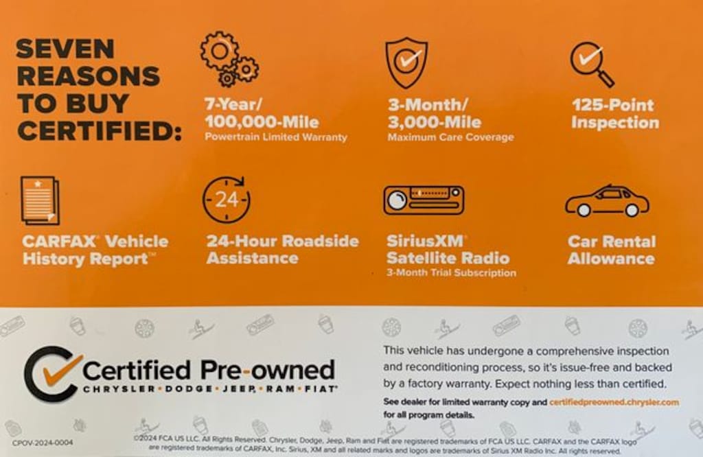 * Vehicles Up to 75,000 Miles and/or 5 Model Years. 24-Hour Towing & Roadside Assistance, Car Rental Allowance, CARFAX® Vehicle History ReportTM and an Introductory 3-month Subscription to SiriusXM® Satellite Radio & Certified Warranty Upgrades (for FCA US LLC Certified Pre-Owned program), Vehicles Between 6-10 Model Years and/or 75,001-120,000 Miles. Thorough Reconditioning Process Using Authentic Mopar Parts. 3-Month Trial Subscription for SiriusXM GuardianTM and Satellite Radio (for Certified Pre-Owned Go program), Vehicles Between 0-5 Model Years and/or 75,000 Miles. Thorough Reconditioning Process Using Authentic Mopar Parts. 12 Month/12,000 Mile Extended Care Premium Warranty, Car Rental Allowance, 3-Month Trial Subscription for SiriusXM GuardianTM and Satellite Radio (for Certified Pre-Owned Gold program)