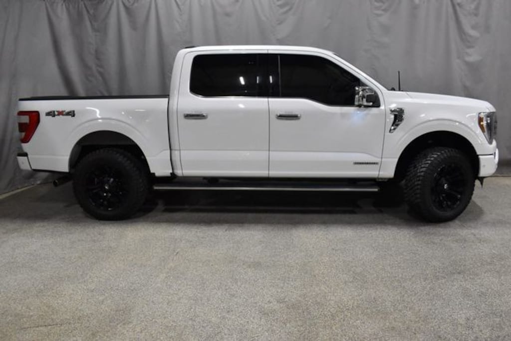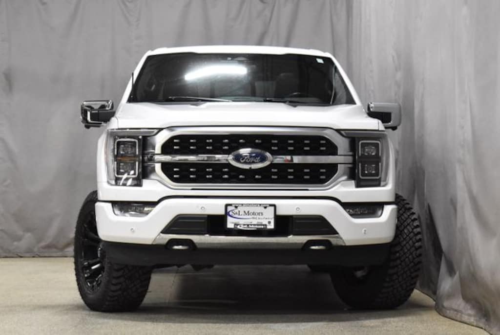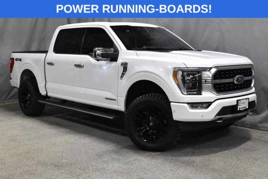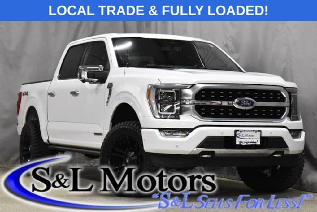 THIS 2022 FORD F-150 PLATINUM IS A LOCAL TRADE WITH A CLEAN HISTORY AND PACKED WITH PREMIUM FEATURES. POWERED BY THE IMPRESSIVE 3.5L POWERBOOST FULL-HYBRID ENGINE PAIRED WITH A 10-SPEED AUTOMATIC, THIS TRUCK DELIVERS OUTSTANDING PERFORMANCE AND CAPABILITY. STAR WHITE METALLIC TRI-COAT PAINT COMBINED WITH POLISHED 20" ALUMINUM WHEELS AND UPGRADED TIRES GIVE IT A BOLD, UPSCALE LOOK. INSIDE, YOUâLL ENJOY PREMIUM BLACK LEATHER BUCKET SEATING, A PANORAMIC TWIN PANEL MOONROOF, AND ADVANCED DRIVER ASSISTANCE FEATURES. BUILT TO WORK AND TO TRAVEL IN LUXURY, THIS PLATINUM IS READY FOR ITS NEXT OWNER!
